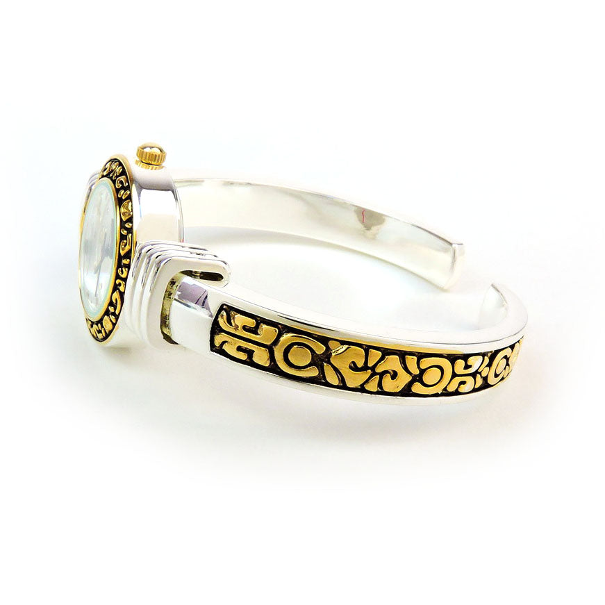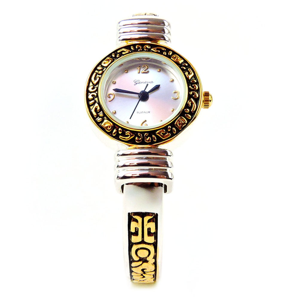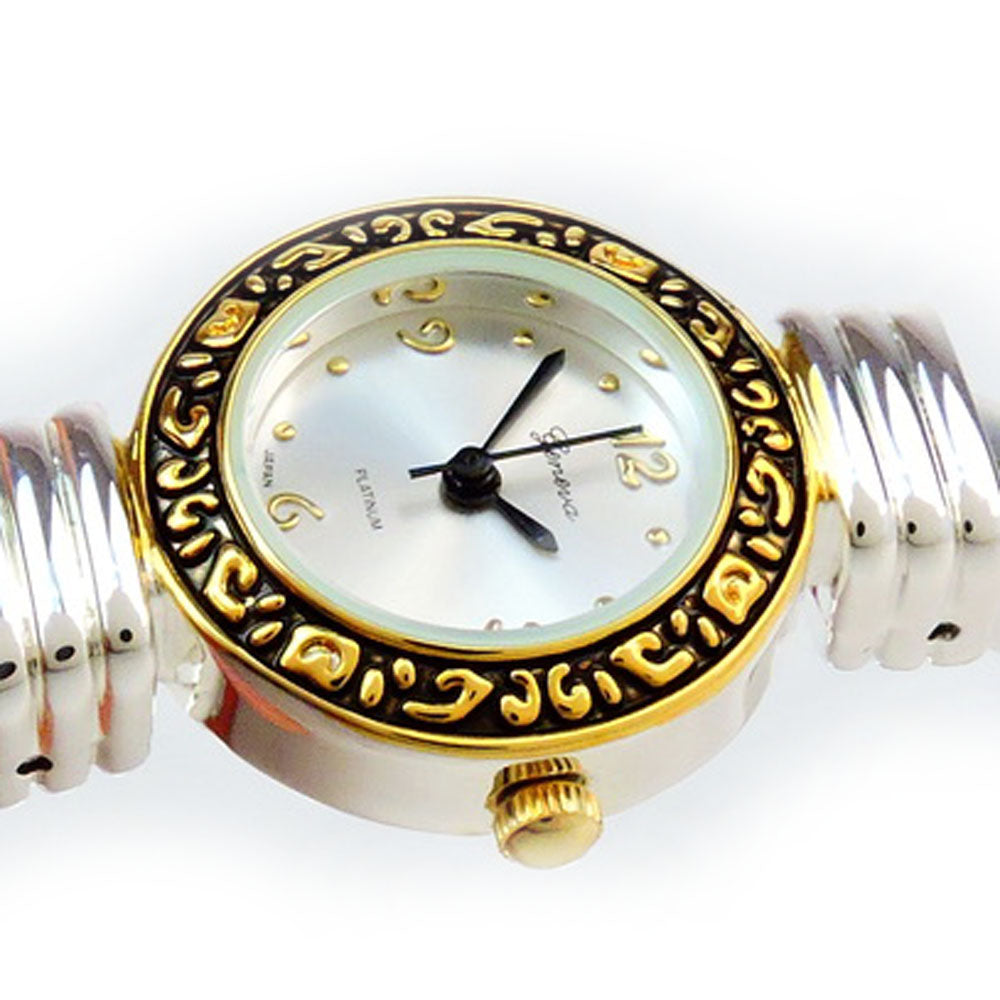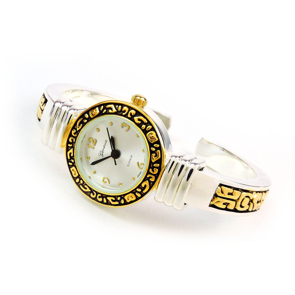 Beautiful Western Style Bangle Cuff Watch by STC. The band is about 0.25 inches (8 mm) wide that will open to fit all wrists from 6.5 to 7 inches. The surrounding case is polished finish and has a white round dial with black hands.